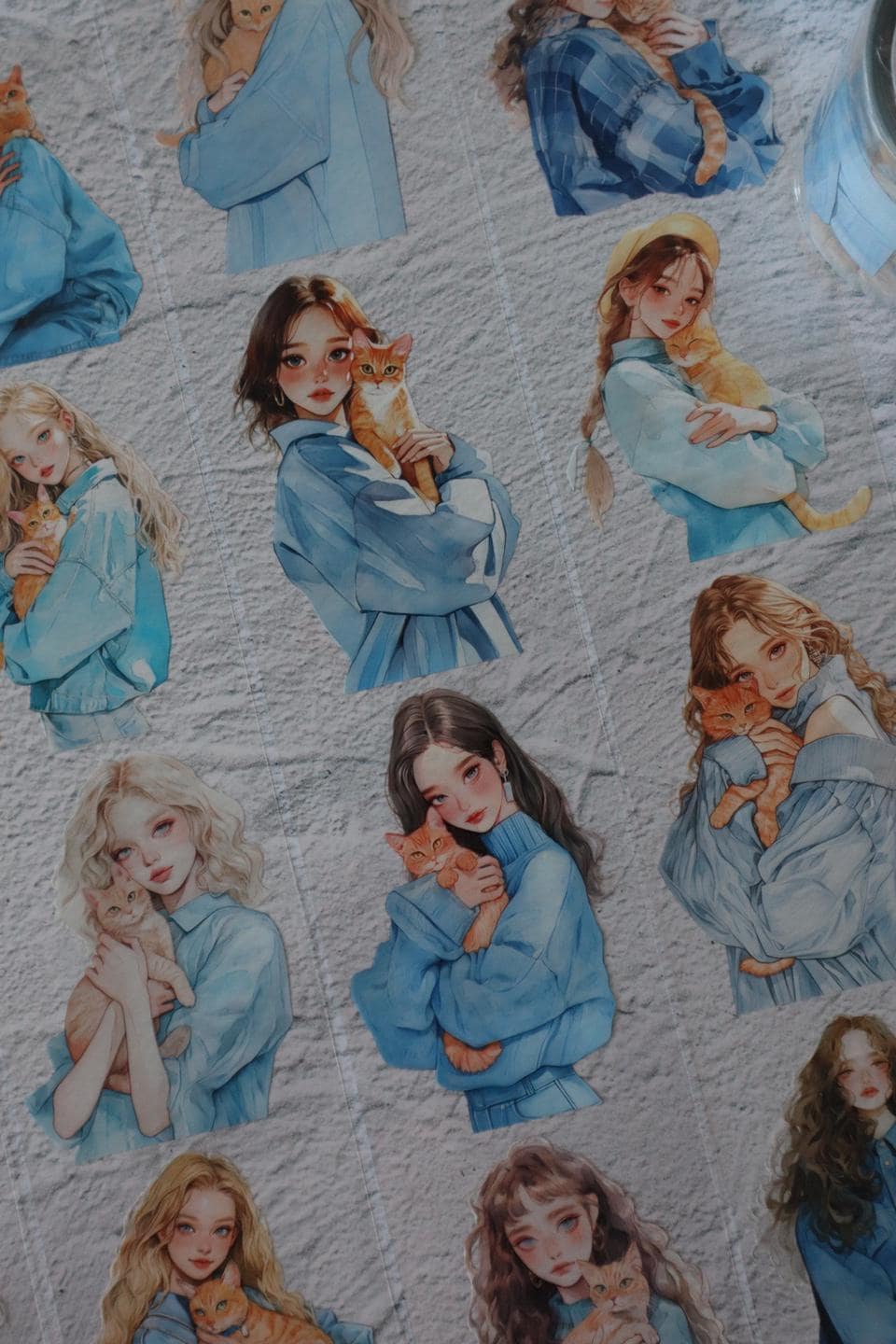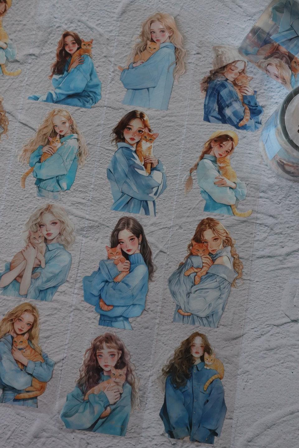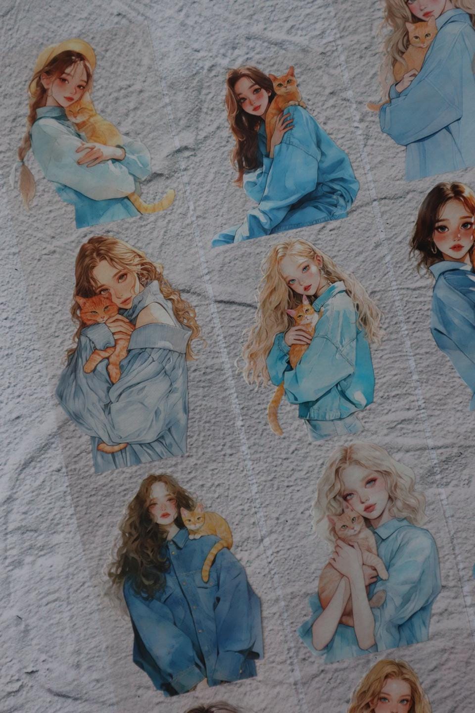 OURTIME) Cat And Blue Girl Pet tape - 3D Glossy Printing 200cm(100cm x 2cut)