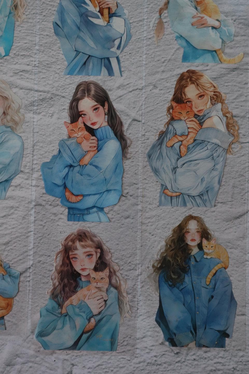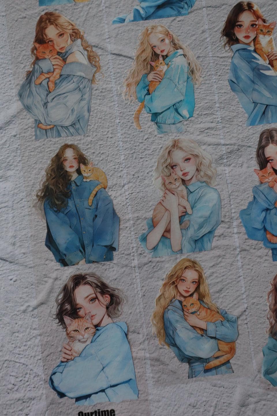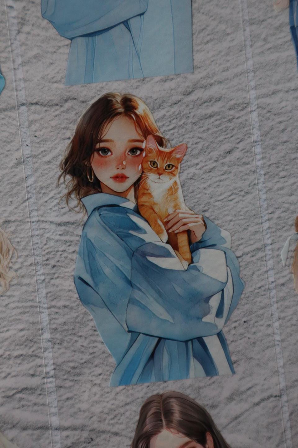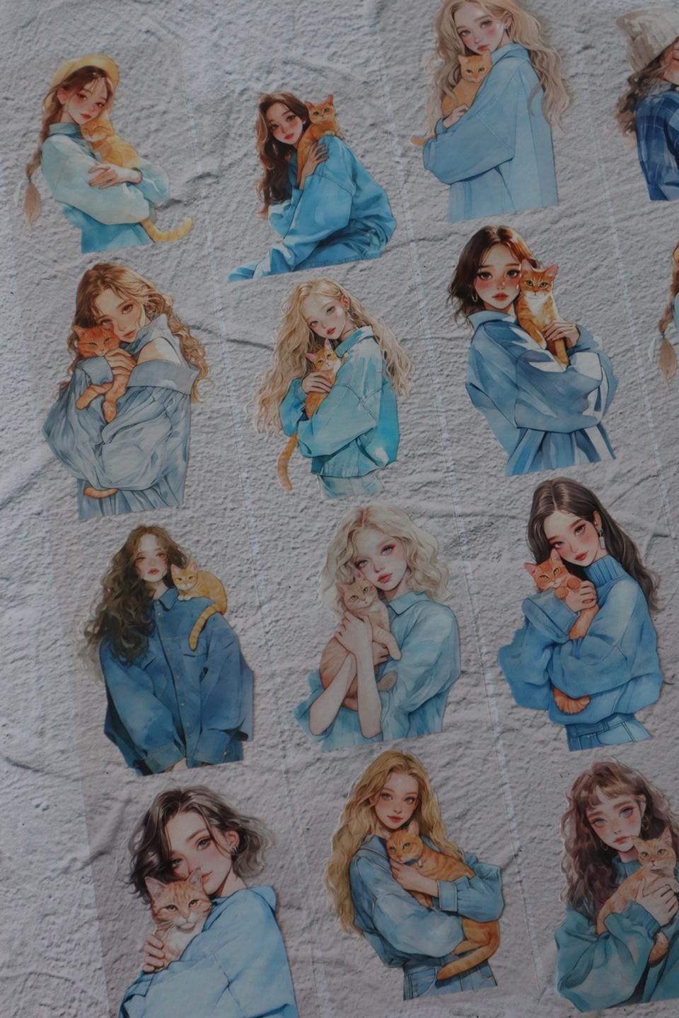 OURTIME) Cat And Blue Girl Pet tape - 3D Glossy Printing 200cm(100cm x 2cut)